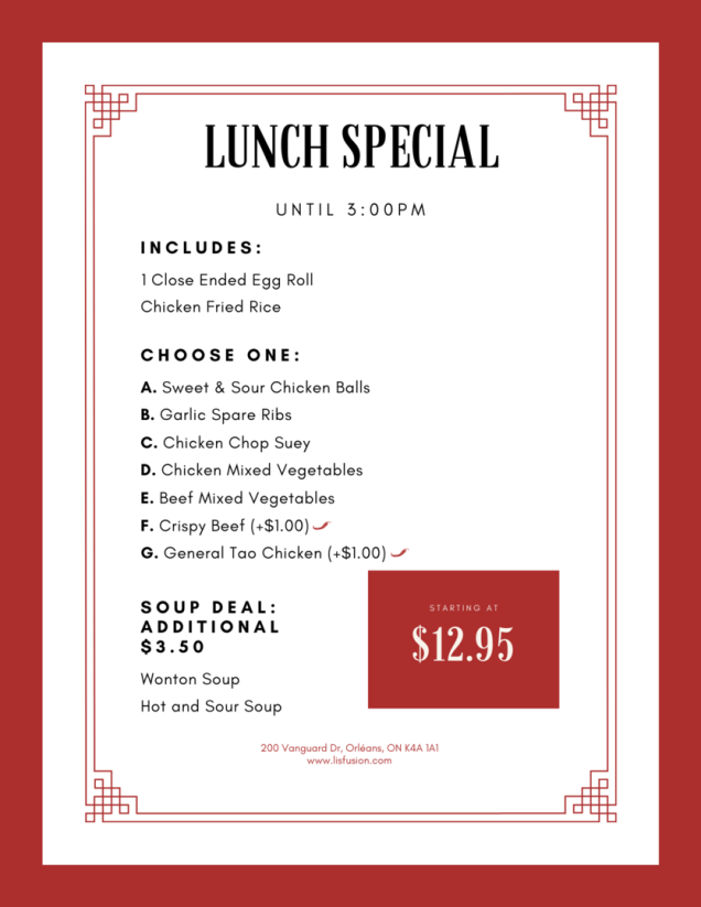 Lunch Specials: Indulge in favorites like Sweet & Sour Chicken Balls and General Tao Chicken, all priced at a wallet-friendly CA$12.95.